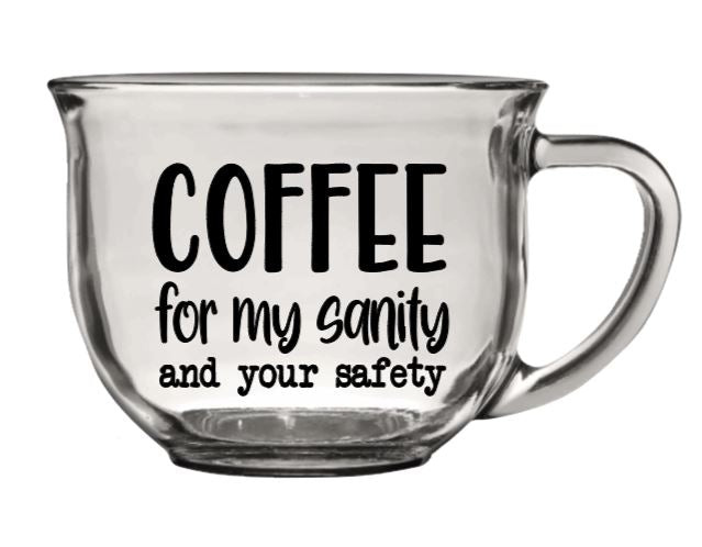 "Coffee for my sanity" glass coffee mug, perfect for every coffee lover! A personalized coffee mug is the perfect gift for any occasion, especially for the coffee lover in your life. These are the ultimate holiday gifts, birthday presents, or just a little something for yourself. You can also order a mug with a date on it, or a special portrait of your loved one.